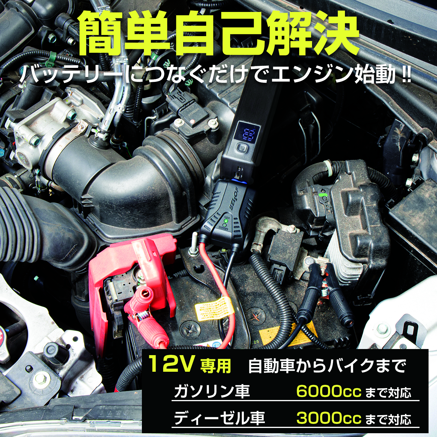 | 注意事項 | ●安全にご使用いただく為にも、必ず1ケ月に一度は満充電になるようメンテナンスを行ってください。 ●夏場の車内などの気温45度以上になる場所への保管は、リチウムイオン電池の劣化に繋がる恐れがあるためおやめください。 ●モバイルバッテリージャンプスターターに内蔵のリチウムイオン電池の修理・交換はできません。無理の分解は、製品破損の原因となりますのでおやめください。 ●必ず、ジャンプスタートする車両の取扱説明書に従ってマイナス端子接続箇所を確認してください。万が一、マイナスケーブルの長さがマイナス端子接続箇所に満たない場合はご使用になれません。 |