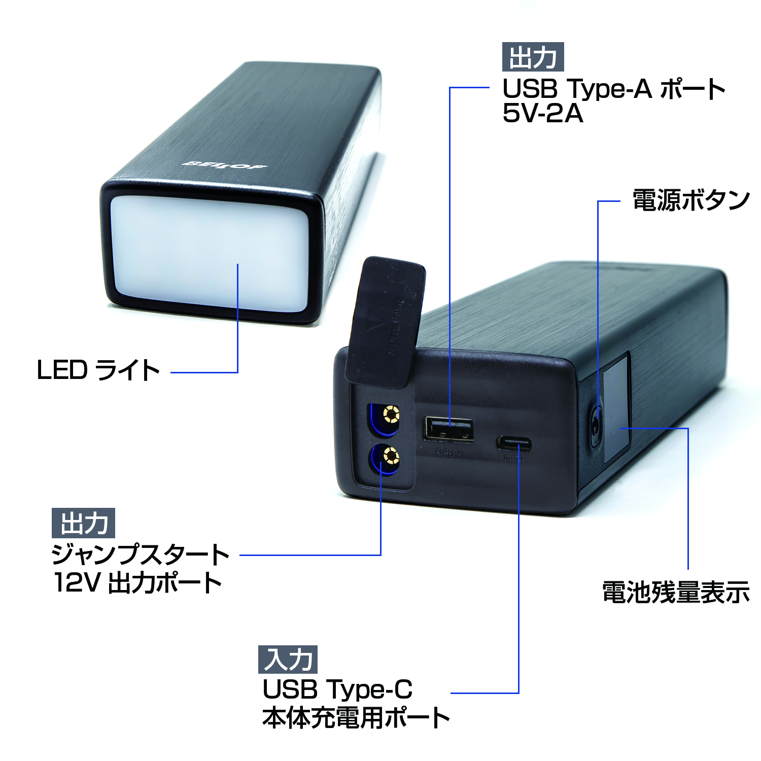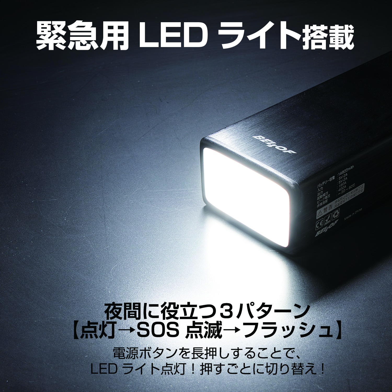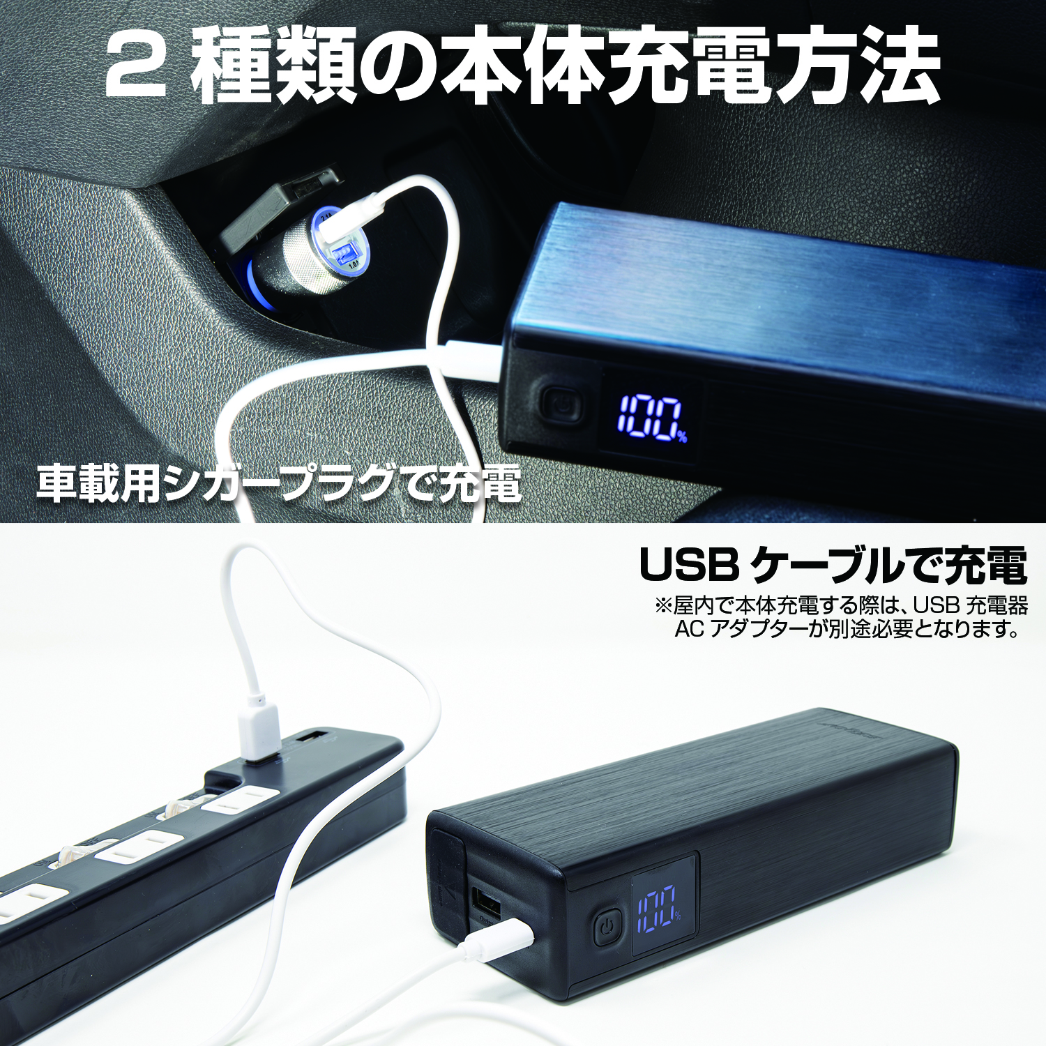 | 製品詳細 | ◆エンジンジャンプスターター まさかのバッテリー上がりにもこれでOK。 手のひらサイズのボディで、12Vのバイクから自動車までのエンジンスタートに使用可能です。 ◆ジャンプスタート時のトラブルを回避するセーフティー・モジュール ジャンパーケーブル 【逆接続保護機能】 プラスとマイナスを間違えても音と光でお知らせします。 【ショート保護機能】 バッテリーを感知しないと出力せず、ショートしません。 【過充電保護機能】 本体充電時に満充電を感知した際、充電を停止し過充電を防ぎます。 ◆USB充電 各種スマートフォン、タブレット、携帯ゲーム機等の幅広い端末に対応します。 (SmartPhone / Tablet / iPhone / iPad / PSP / Digital Camera / etc) ◆LEDライト LEDライトを装備。 通常点灯・点滅・SOS点滅の3つのパターンを選べ、緊急時にも活躍します。 |