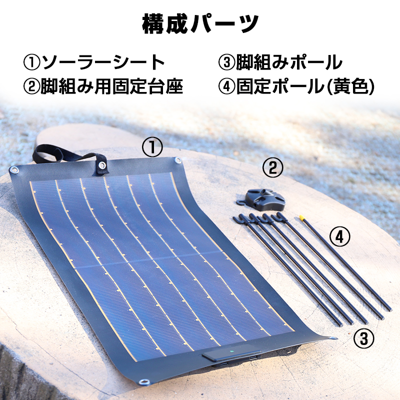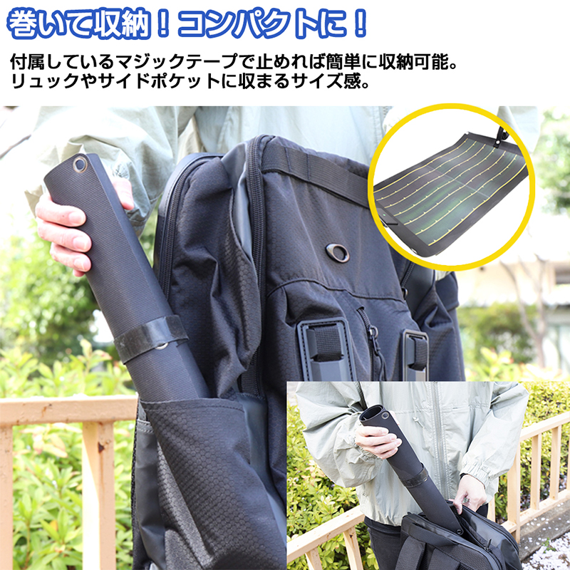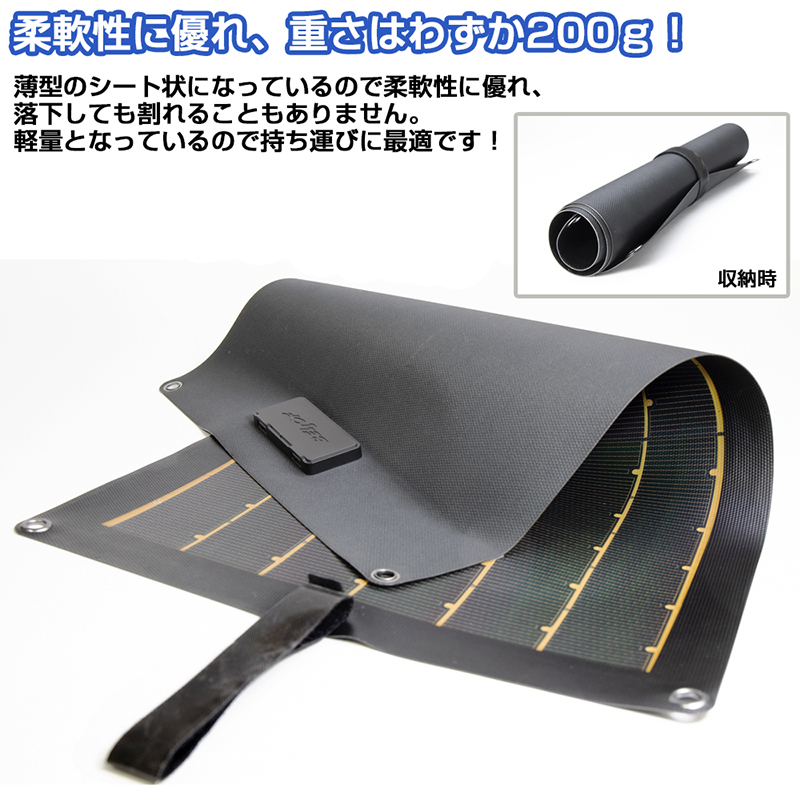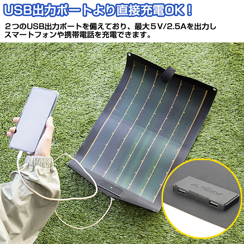 | 製品詳細 | ■サイズ:540×325mm ■重量:約200g ■最大電力:15W ■USB出力:2ポート(5V/2.5A) ■使用温度:5℃~60℃ ■防塵・防水性能:IP65 |