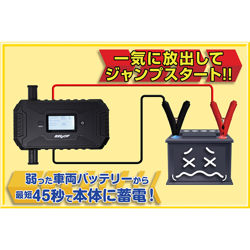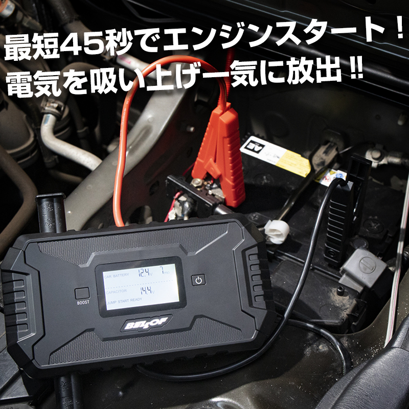 | 製品詳細 | 多くの車両を管理されている整備工場、車両販売店舗、レンタカー店舗など、さらに、マリーナや船舶にも常備しておけば、万が一のバッテリー上がりにも安心!また、農耕機にも使用できます!! 弱った車両バッテリー(5V以上)から最短45秒でキャパシタ本体に電気を吸い上げ、車両バッテリーへ一気に放出する事でエンジン始動が出来ます。 12Vのバイクから6000ccまでのガソリン車、2500ccまでのディーゼル車に対応!ボート、農耕車のバッテリー上がり対策にも好評です!!(12V専用) |