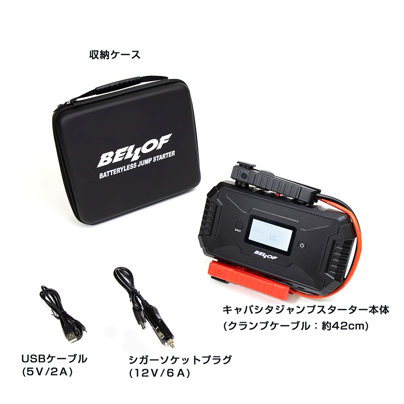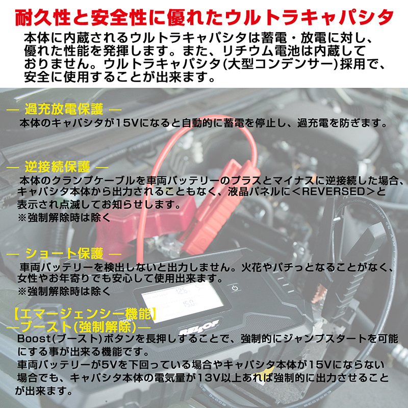 | 注意事項 | ※ハイブリッド車/電気自動車(EV)について ハイブリッド車/電気自動車(EV)からキャパシタ本体への蓄電は行えない為、他の車のバッテリー・シガーソケット・USBポートよりキャパシタ本体へ蓄電後ご使用下さい。 ※エンジン始動について エンジン始動の条件は、対象のバッテリーコンディションによります。すべてのエンジン始動を保証するものではありません。 |