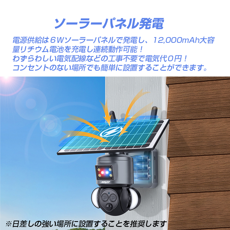 | 製品詳細 | ★フルHDを上回る2304×1296Pのダブルレンズで、昼も夜も鮮明に撮影可能! 水平方向270℃+垂直方向90℃の回転可能で隅々までくっきり! ★コンパクトなボディにワイドレンズと望遠レンズのカメラを搭載! ★光学12倍ズームレンズで遠くのものまでしっかり撮影! ★スマホアプリによる遠隔操作では、リアルタイムで画面をチェック、マイクとスピーカー搭載で双方向通話可能。 ・LEDライトで威嚇 ・アラーム音で威嚇 ・通話機能で音声威嚇 ★IP66防塵防水。-20℃~60℃の幅広い環境の温度に対応。 |