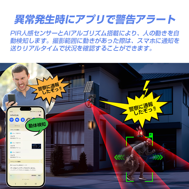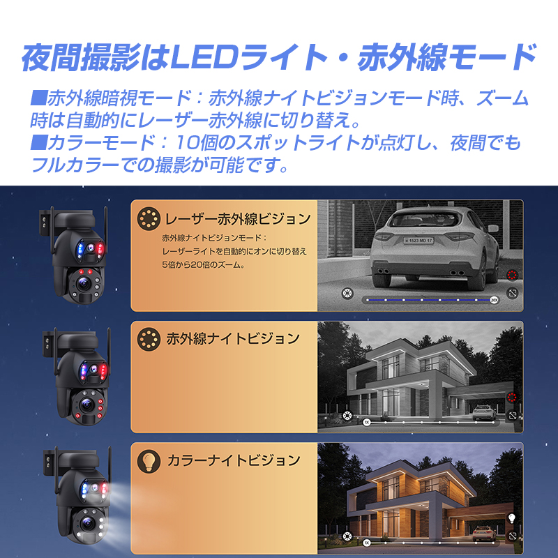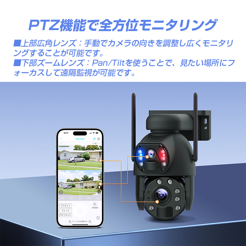 | 製品詳細 | ★フルHDを上回る2304×1296Pの独立型ダブルレンズ採用で、昼も夜も鮮明に撮影可能! ★本体上側の広角レンズと本体下側の望遠レンズの独立型ダブルカメラを搭載し隅々までくっきり! ★光学20倍ズームレンズで遠くのものまでしっかり撮影! ★スマホアプリによる遠隔操作では、リアルタイムで画面をチェック、マイクとスピーカー搭載で双方向通話可能。 ・LEDライトで威嚇 ・アラーム音で威嚇 ・通話機能で音声威嚇 ★IP66防塵防水。-30℃~60℃の幅広い環境の温度に対応。 |